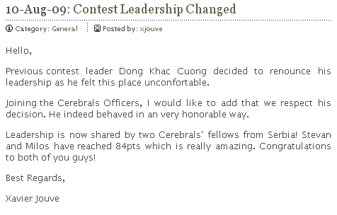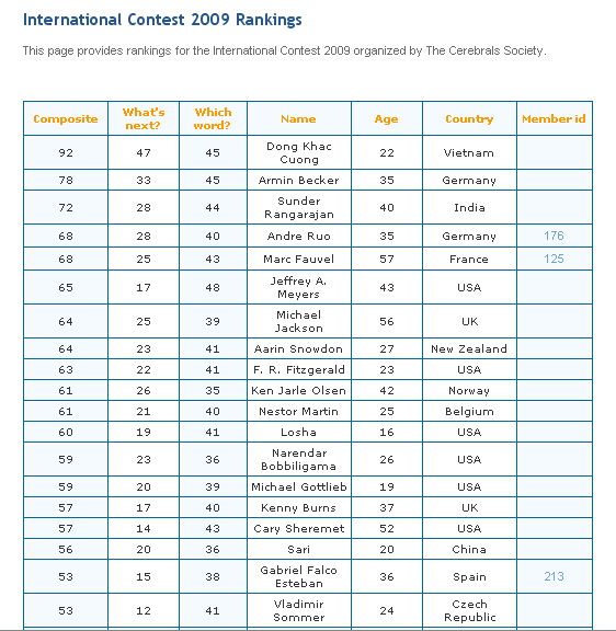 2009 - Cuộc thi trí tuệ toàn cầu - tổ chức bởi Cerebrals Society - tác giả tiến sĩ tâm lý học Xavier Jouve (người Pháp Link, sáng lập tổ chức IQ cao Quốc tế Cerebrals Society). Lần gửi đầu tiên: Điểm số 92/100 (đứng thứ nhất) LINK LINK 2
