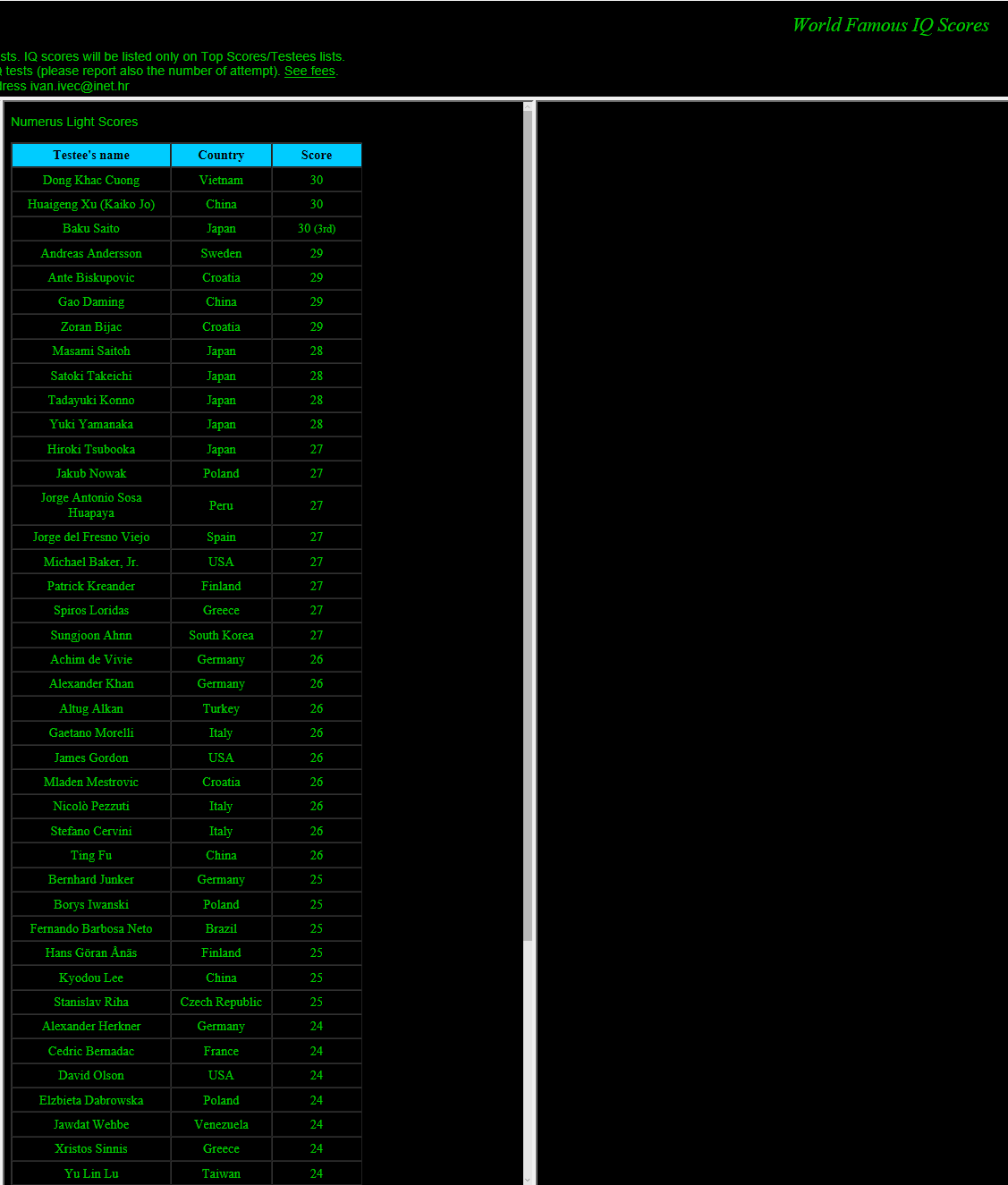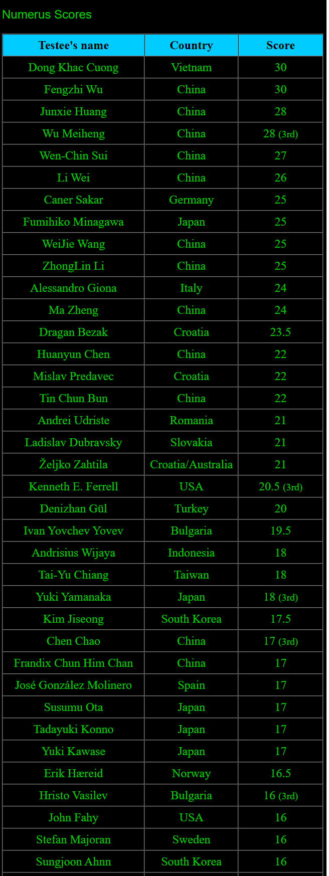 2019 (2025)- Numerus- tác giả Ivan Ivec - giáo sư toán học, Ivan Ivec xếp hạng 16 người thông minh nhất thế giới theo Yahoo Link, sáng lập nhiều tổ chức IQ cao Quốc tế như Nano Society, Ultima Society, Grand Society, Universal Society, Real IQ Society, Intruellect Society.. Năm 2012 ông được tạp chí danh tiếng Business Insider chọn là người được đề cử ra 16 bài test tốt nhất dành cho thiên tài Link. 20 năm bài test điểm số 30/30 đứng thứ nhất thế giới IQ 190+ SD15 LINK LINK 2