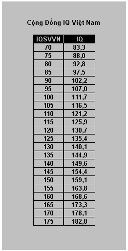 Với sai số rất nhỏ này, ta có: Công thức liên hệ giữa IQ của Sinh Viên Việt Nam (IQ SVVN) và IQ của dân số: (Dùng chuẩn SD 15)